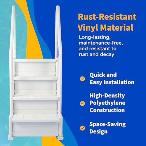 • BUILT TO LAST, WARRANTY INCLUDED – Constructed from maintenance-free, high-density polyethylene, this step resists wear, fading, and pool chemicals. Backed by a 3-year warranty for peace of mind. Dimensions: 81-in H x 32.5-in W x 32-in D. Capacity: 350-lbs.